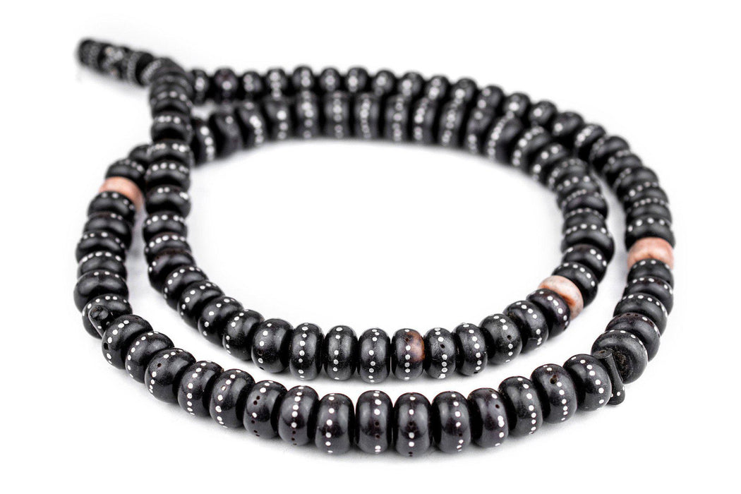 These genuine antique prayer beads are a traditional craft from the Arabian Peninsula. Prized for generations, beads such as these are intricately inlaid by master craftsmen to create the unique and beautiful designs that characterize this unique art form. Look carefully and you will see that each silver dot has been individually applied and that no two beads are alike. Commonly referred to as black coral these highly sought-after prayer beads are believed by some to have mystical properties. This unusual piece would be considered a special strand to be used for prayer or meditation. Yemen has historically been a primary source of Black Coral beads like these. Such beads are also found in other parts of the Islamic world including North and East Africa where they have been distributed through the years by merchants and traders. Antique beads such as these have some age and will show signs of wear including imperfections. This unique strand of rondelle-shaped beads has been nicely finished with a traditional end-piece. This strand weighs approximately 116 grams. You will receive the exact strand pictured.