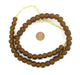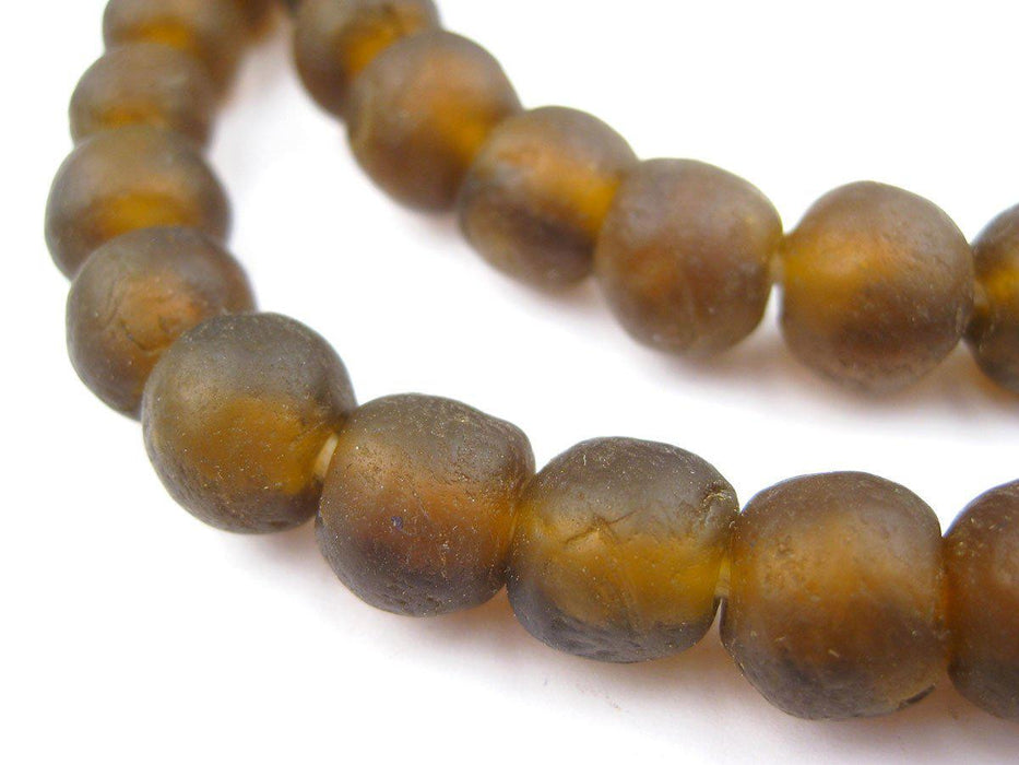 Recycled glass beads are a type of indigenously produced African bead from Ghana West Africa. These beautiful root beer color recycled beads are made using an old method that has been used for centuries. The glass itself is derived from a variety of recycled sources including old beverage and medicine bottles. The procedure for making the beads consists of a number of steps whereby powdered glass is poured into molds of clay and baked in a specialized oven. These beads are produced in large part by the Krobo tribe and through recycling glass are environmentally friendly.