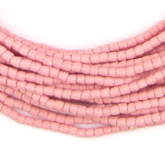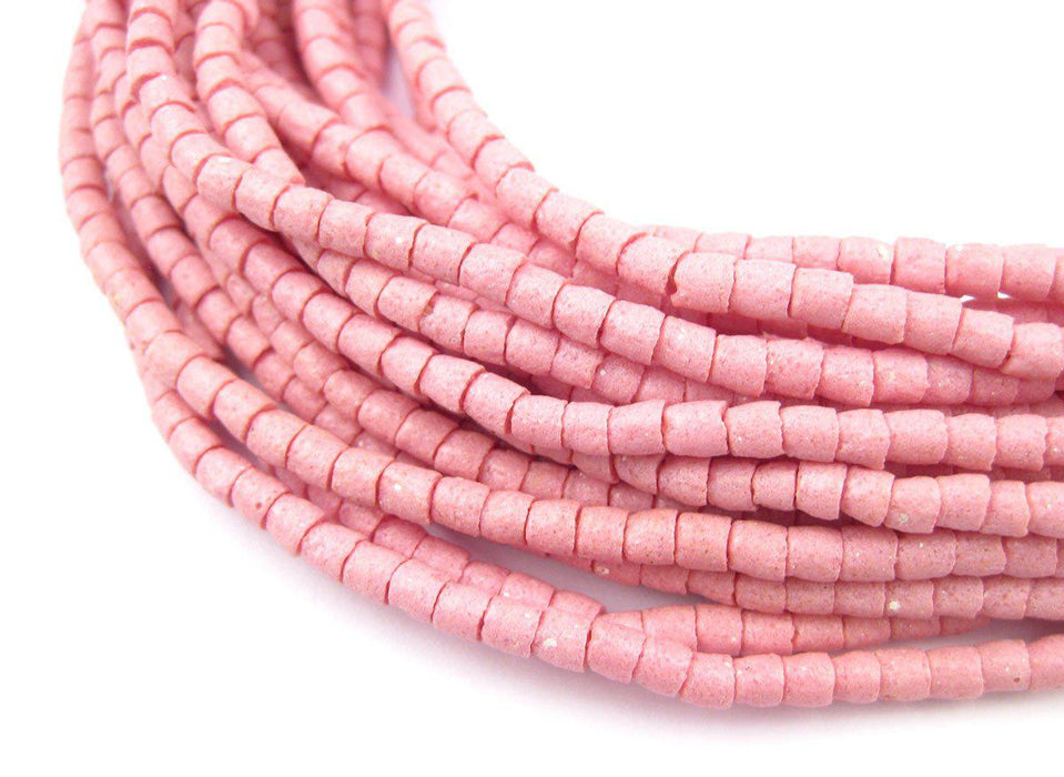 Checkout this beautiful strand of pink sandcast beads from Ghana, West Africa. Beads such as these are often worn as traditional waist beads. The process of making these beads is unique to Africa and has been used for over 1000 years. Pulverized glass of various colors is poured into a clay mold, using a cassava stem for the bead's hole. The mold is placed in a furnace and heated until the glass particles congeal without actually melting and the stem burns out. The Ghanaians have been making beads in this manner since the 1600s. Multiple strands shown. Each strand is sold individually. Shade of pink may vary slightly from photo.