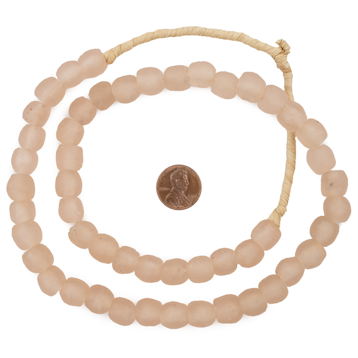 Recycled glass beads are a type of indigenously produced African bead from Ghana West Africa. These beautiful rose color recycled beads are made using an old method that has been used for centuries. The glass itself is derived from a variety of recycled sources including old beverage and medicine bottles. The procedure for making the beads consists of a number of steps whereby powdered glass is poured into molds of clay and baked in a specialized oven. These beads are produced in large part by the Krobo tribe and through recycling glass are environmentally friendly.