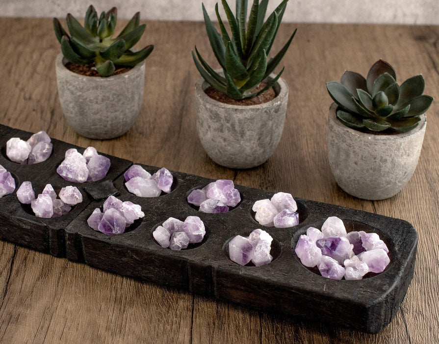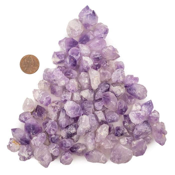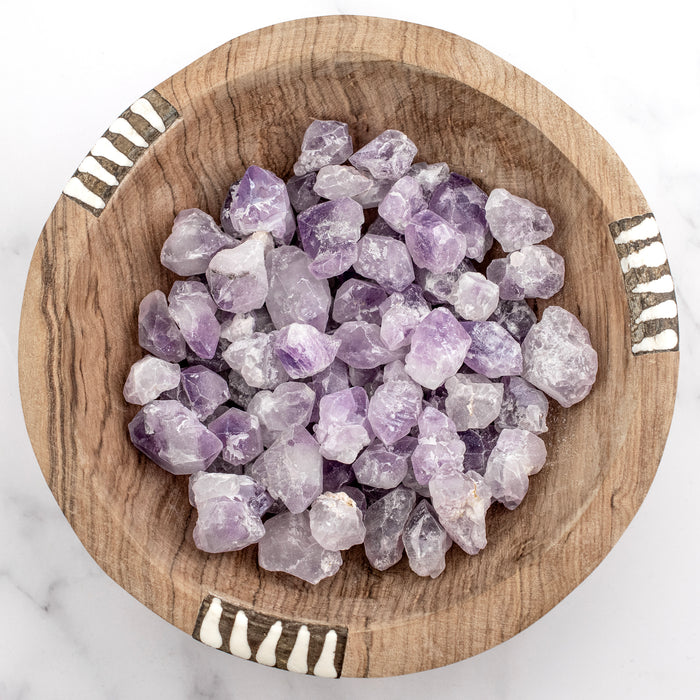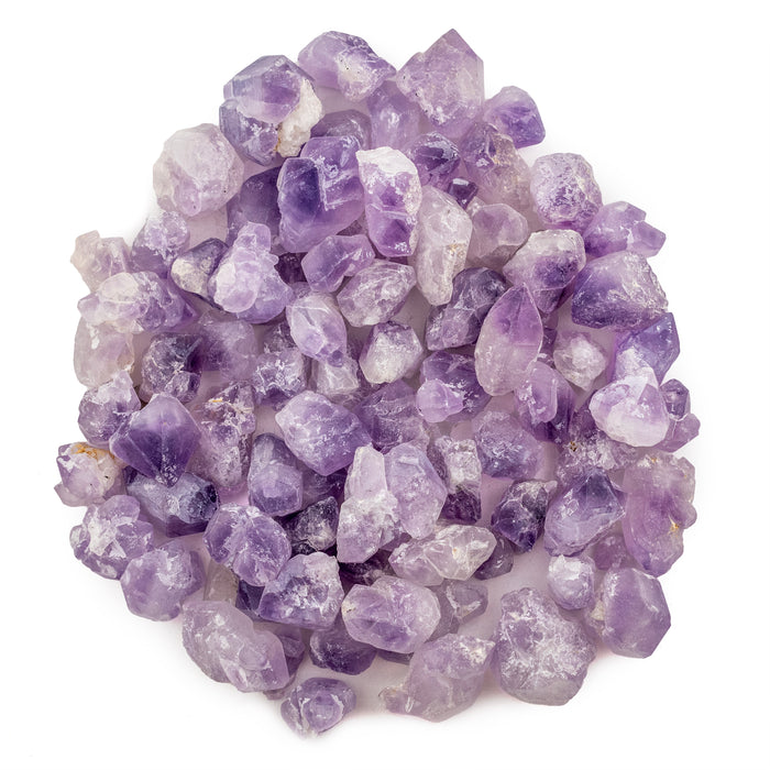 This beautiful set of Amethyst Gemstones will make a great addition to your crafting and decor projects. Made from natural Amethyst Crystals these stones feature a striking translucent purple hue. This set comes with a variety of Amethyst stones in different shapes, sizes, and color tones, so you can find the perfect fit for all of your design projects. Amethyst is said to be a soothing and healing stone, it is often used in meditation, and is said to open intuition and enhance spiritual awareness, making these gemstones great for spiritual purposes. These crystals also look nice as home decor, laid out on a book shelf or placed in a decorative bowl. Each individual stone ranges in size from 12-15mm to 15-25mm. These stones are not drilled so they do not have a stringing hole. This Amethyst set is great for creating intricate wire wrapped elements in necklace and bracelet designs. Each gemstone pack comes with about 60 to 75 individual stones. With their chic color range and rich textures, these Rough Amethyst Gemstones will become a staple piece for your jewelry design kit.