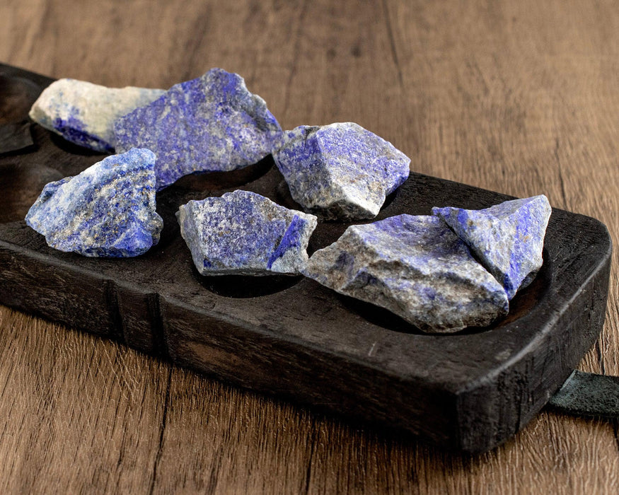 Take a closer look at these striking raw Lapis Lazuli gemstones. Lapis Lazuli is known for its unique deep blue hue and shimmering textures. These beautiful stones preserve the natural character of the stone with minimal processing, cutting and polishing. These Lapis stones are perfect to use in wire wrapping design projects. These stones also work great as home decor, laid out on a book shelf or placed in a decorative bowl. Each Lapis Lazuli Stone has a unique nugget shape and a pattern of its own that is sure to draw attention. Each stone measures roughly 18-22 x 30-40mm, these stones are not drilled so they do not have a stringing hole. Each crystal pack comes with about 4 to 7 individual stones. It's time to get creative with your next project. Get your hands on this great set of Lapis Lazuli Gemstones and start crafting today.