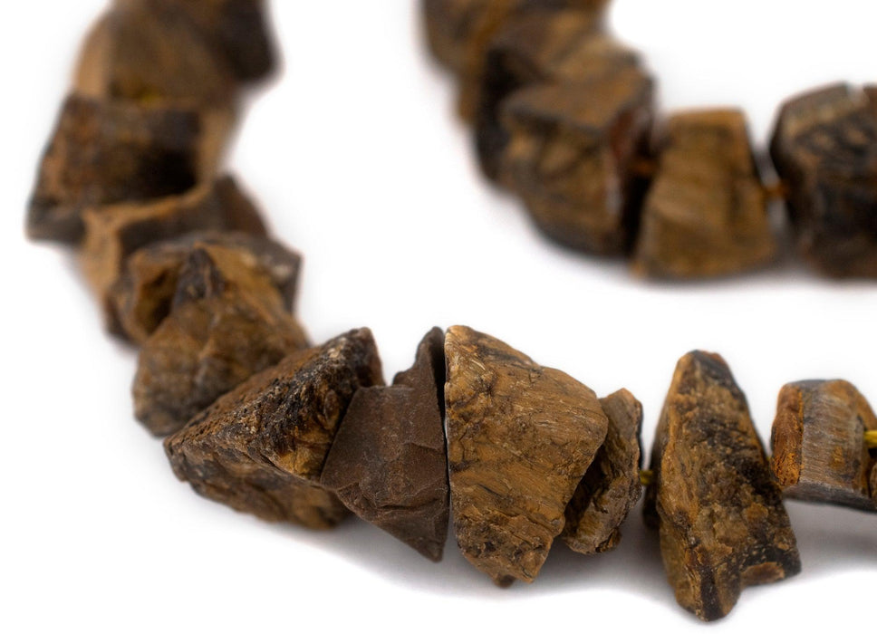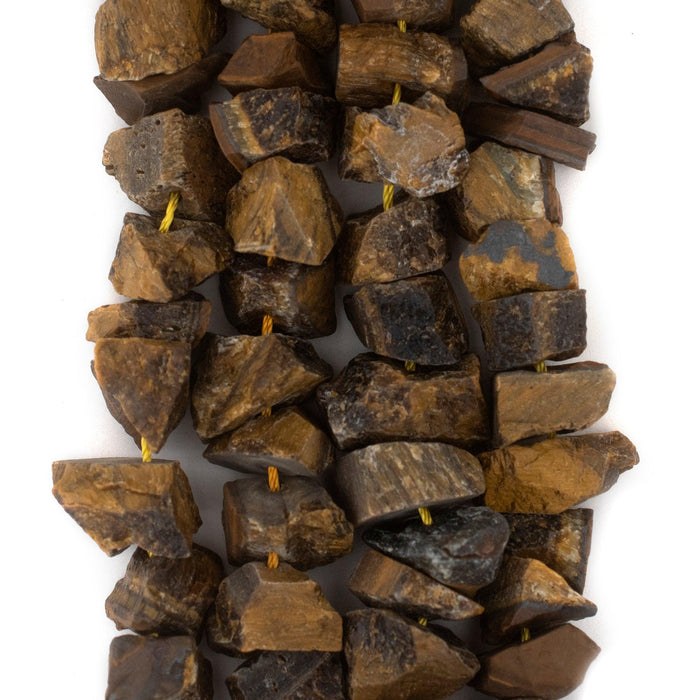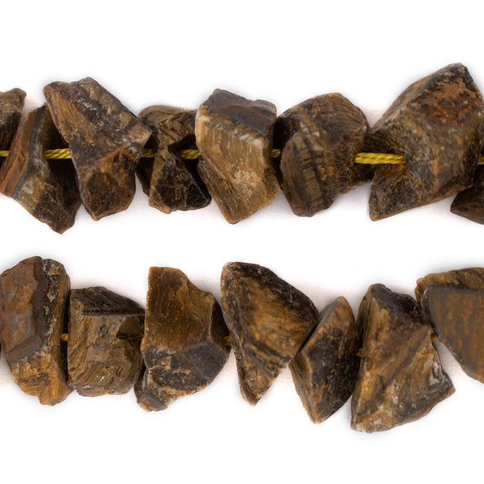 Admire these beautiful raw gemstone beads made from rough Tiger's Eye. Tiger's eye is known for its golden color and silky luster. Stone for such beads is primarily mined in South Africa and Western Australia. In some cultures, Tiger's Eye is said to ward off the evil eye, and is also known for its therapeutic properties. These beautiful beads preserve the natural character of the stone with minimal processing, cutting and polishing. These strands work great as home decor, laid out on a book shelf or placed in a decorative bowl. The beads can also be incorporated in your own custom jewelry designs. Each bead measures approximately 2-12 x 14-18mm with a hole size of approximately 1mm. You will receive a full strand measuring approximately 17". Get yours today!