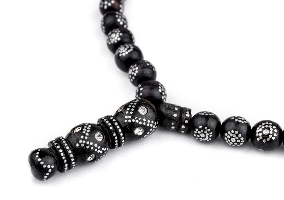 These authentic black coral beads are a traditional craft of the Arabian Peninsula. Prized for generations, beads such as these are intricately inlaid by master craftsmen to create the unique and beautiful designs that characterize this unique art form. Look carefully and you will see that each silver dot has been individually applied and that no two beads are alike. Commonly referred to as Black Coral, these rare and highly sought-after beads are believed by some to have mystical properties. This unusual piece would be considered a special strand to be used for prayer or meditation. Yemen has historically been a primary source of Black Coral beads. Such beads are also found in other parts of the Islamic world including North and East Africa where they have been distributed through the years by merchants and traders. Antique beads such as these have some age and will show signs of wear including imperfections. This unique strand of round-shaped beads has been nicely finished with a traditional end-piece. The strand weighs approximately 74 grams. You will receive the exact strand pictured.
