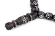 These genuine Islamic prayer beads are a traditional craft of Yemen. Prized for generations, beads such as these are intricately inlaid by a master craftsman to create the unique designs that characterize this unique art form. Look carefully and you will see that each silver dot has been individually applied and that no two beads are alike. Commonly referred to as Black Coral, these rare and highly sought-after beads are believed by some to have mystical properties. This unusual piece would be considered a special strand to be used for prayer or meditation. Yemen has historically been a primary source of Black Coral beads. Such beads are also found in other parts of the Islamic world including North and East Africa where they have been distributed by Traders. Antique beads such as these have some age and will show signs of wear including imperfections. This unique strand of round beads has been nicely finished with a traditional end-piece and weighs approximately 50 grams. You will receive the exact strand pictured.