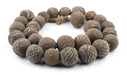 Take a look at this great strand of black colored terracotta beads from Mali. Beautifully hand crafted, each bead may show slight variation in size and pattern and measures approximately 19-25 x 22-25mm, with hole size of 2-3mm. Each strand measures approximately 29" in length, and contains approximately 29 beads. These beads show some wear due to age.