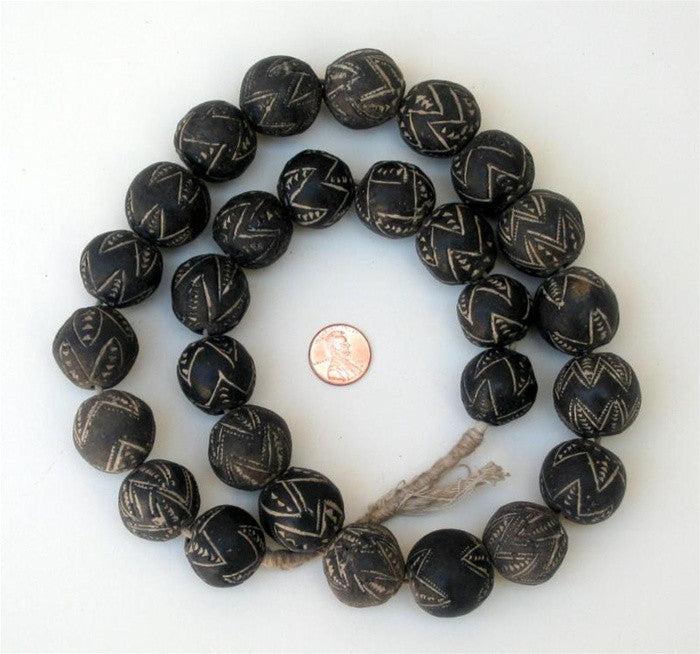 This beautiful strand of Mali Spindle Whorl beads is handmade with clay and individually inscribed. The strand is approx. 28" long with beads about 25 mm in diameter. Strand may vary slightly from strand pictured.