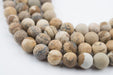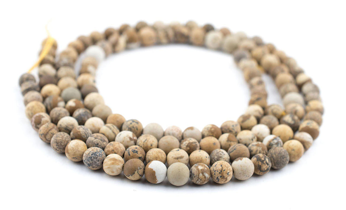 This beautiful strand of matte round picture jasper beads features a blend of brown and beige tones. Each bead measures approximately 6mm in diameter, with a hole size of 1mm. Strands measure approximately 15 inches in length. Two strands pictured. Each strand sold individually.