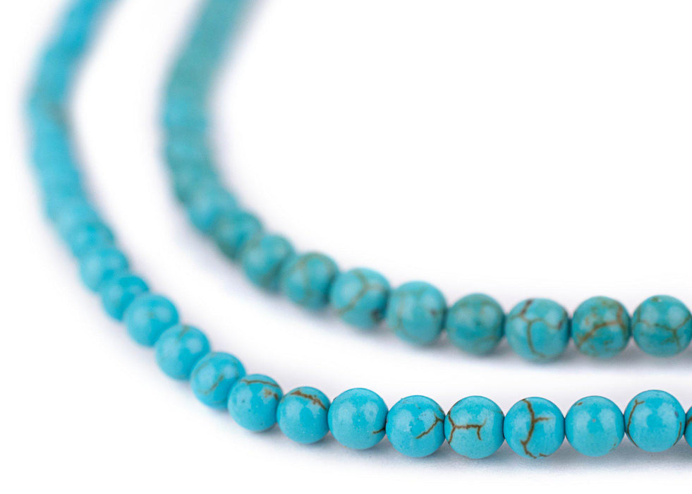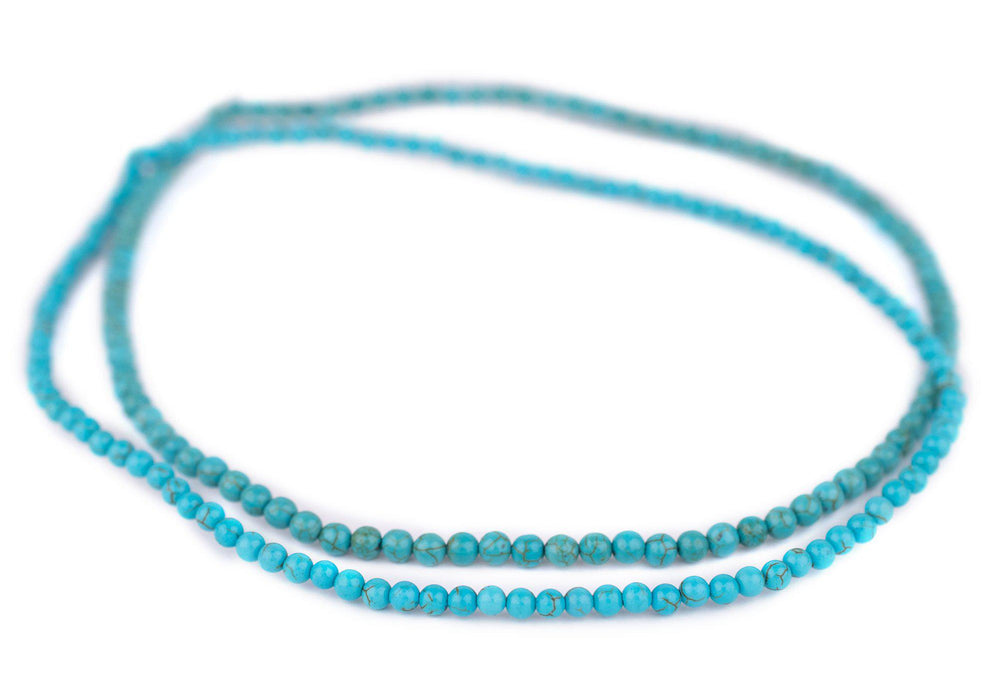 These faux turquoise stone beads will add a splash of color to any jewelry designs. Look carefully and you will see that many beads have a patterned surface to resemble the inclusions of natural turquoise stone. Available in a variety of sizes and shapes, this specific round bead measures 4 x 4mm with approximately 90 beads on each 15" strand. Try a strand of these beads today!