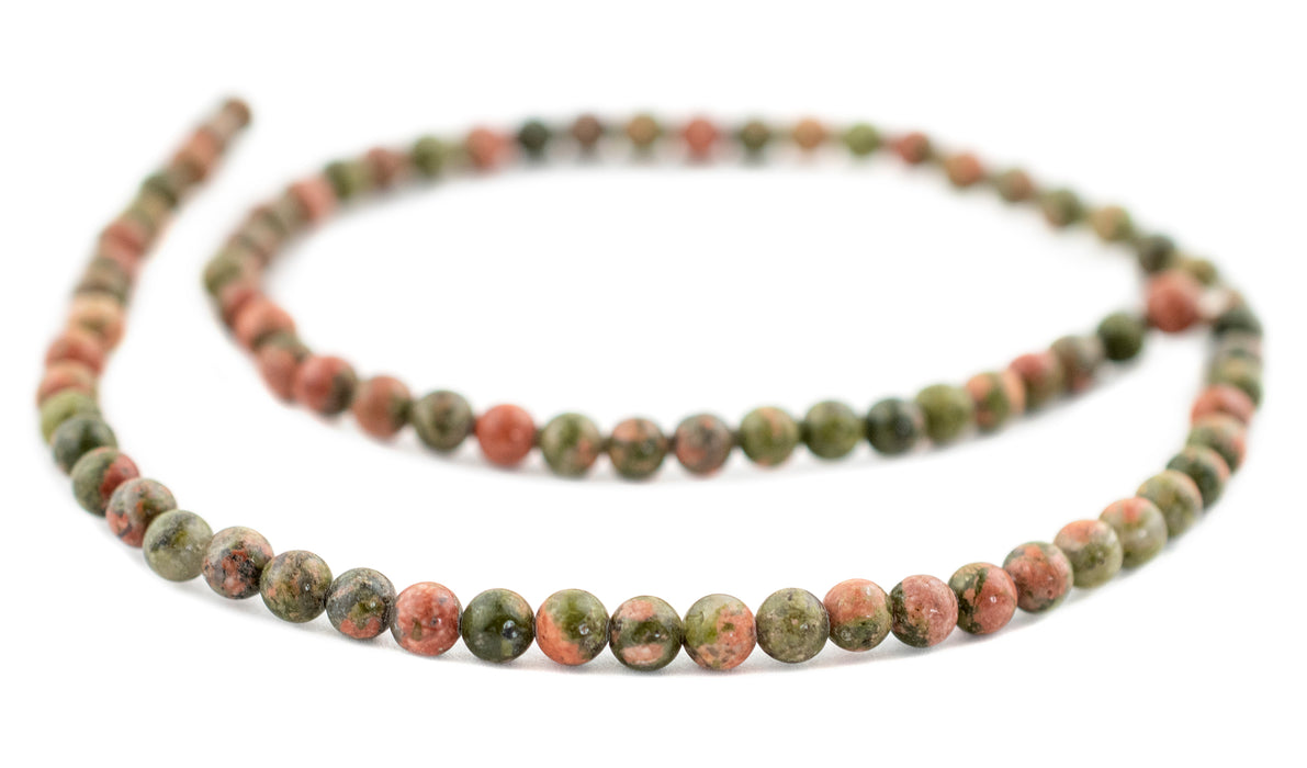 Unakite beads are a beautiful combination of green and pink that create a unique, mottled appearance. These semi-precious gemstones are often used in jewelry-making, particularly for bracelets and necklaces. In addition to their aesthetic appeal, Unakite is believed to have spiritual and healing properties. It is said to help balance emotions and bring a sense of calm and grounding, making it a popular choice for meditation and yoga practice. Some people also believe that Unakite can help with physical ailments such as headaches, muscle and joint pain, and the digestive system. Unakite is also associated with the heart chakra and is believed to promote love, compassion, and emotional healing. It is often used in crystal healing to help release negative emotions and promote forgiveness and understanding. Whether you're drawn to the unique beauty of Unakite beads or interested in exploring the spiritual and healing properties of gemstones, these beads are a stunning and versatile choice that are sure to inspire and delight. Each bead measures approximately 4-5 x 4-5mm with a hole size of approximately 0.5mm. You will receive a full strand measuring approximately 16".
