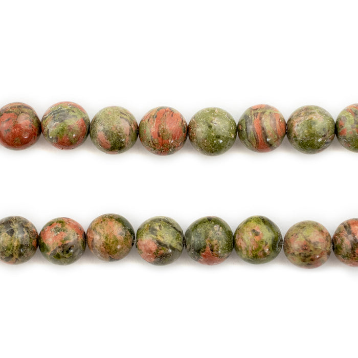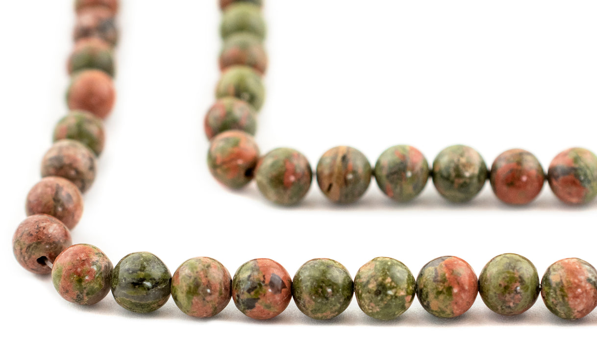 Unakite beads are a beautiful combination of green and pink that create a unique, mottled appearance. These semi-precious gemstones are often used in jewelry-making, particularly for bracelets and necklaces. In addition to their aesthetic appeal, Unakite is believed to have spiritual and healing properties. It is said to help balance emotions and bring a sense of calm and grounding, making it a popular choice for meditation and yoga practice. Some people also believe that Unakite can help with physical ailments such as headaches, muscle and joint pain, and the digestive system. Unakite is also associated with the heart chakra and is believed to promote love, compassion, and emotional healing. It is often used in crystal healing to help release negative emotions and promote forgiveness and understanding. Whether you're drawn to the unique beauty of Unakite beads or interested in exploring the spiritual and healing properties of gemstones, these beads are a stunning and versatile choice that are sure to inspire and delight. Each bead measures approximately 8 x 8mm with a hole size of approximately 0.5mm. You will receive a full strand measuring approximately 16".