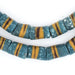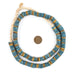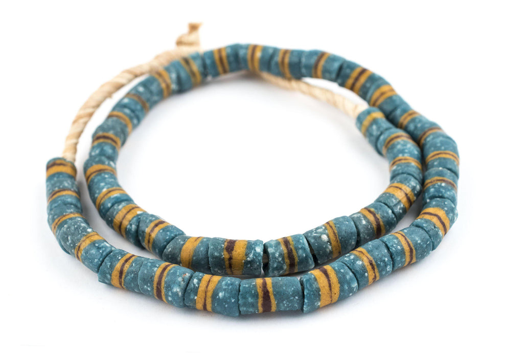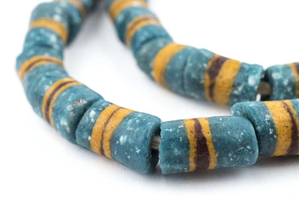 A beautiful strand of powder glass African beads, made by the people of Krobo Mountain (Ghana, West Africa ), reproducing old Venetian FANCY trade beads. Made from bottles and other glass items that are turned into powder, then poured into molds in order to create this nice looking drum shaped beads. Decorations on the beads are made with a paste made of colored glass powder and water, which is applied using a thin wooden stalk. They are cooked a second time to fix the decor. The beads are handmade.