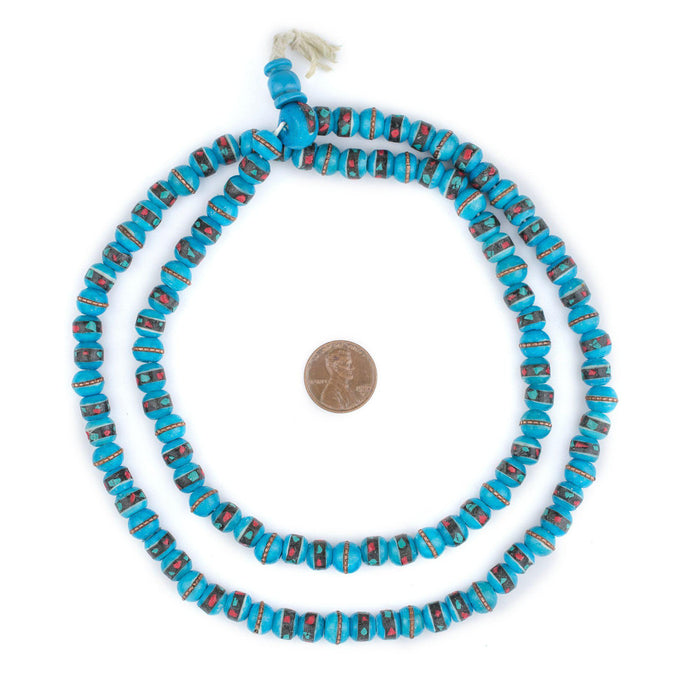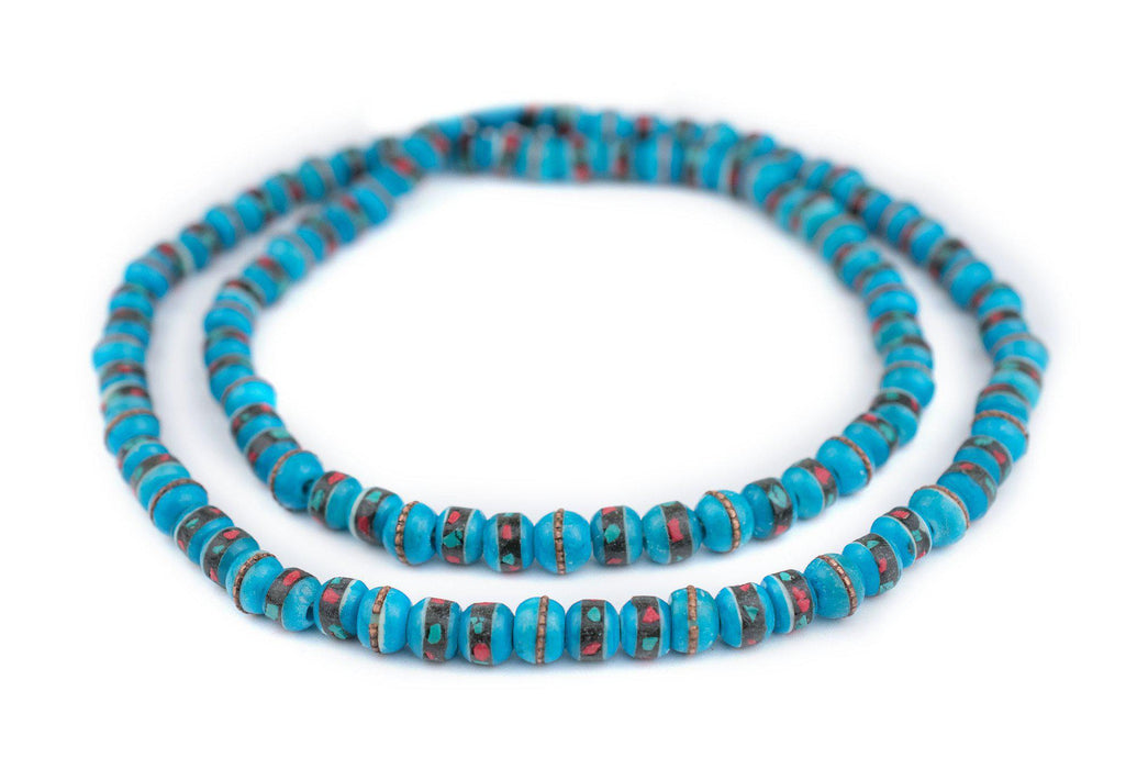 Take a look at this colorful strand of handmade prayer beads made from bone and strung as a 108-bead mala. Each long strand is approximately 26" long, and the beads measure about 6-7 x 7-8mm. Individual beads have been inlaid with brass, turquoise or coral color bits. Another great strand of beads to add to your collection!