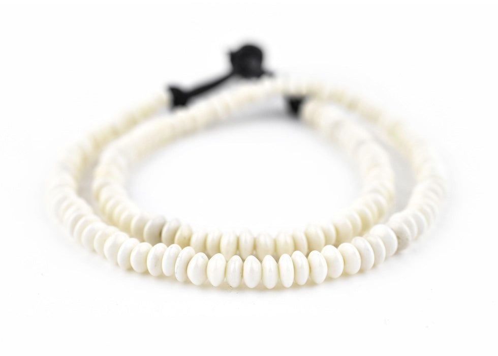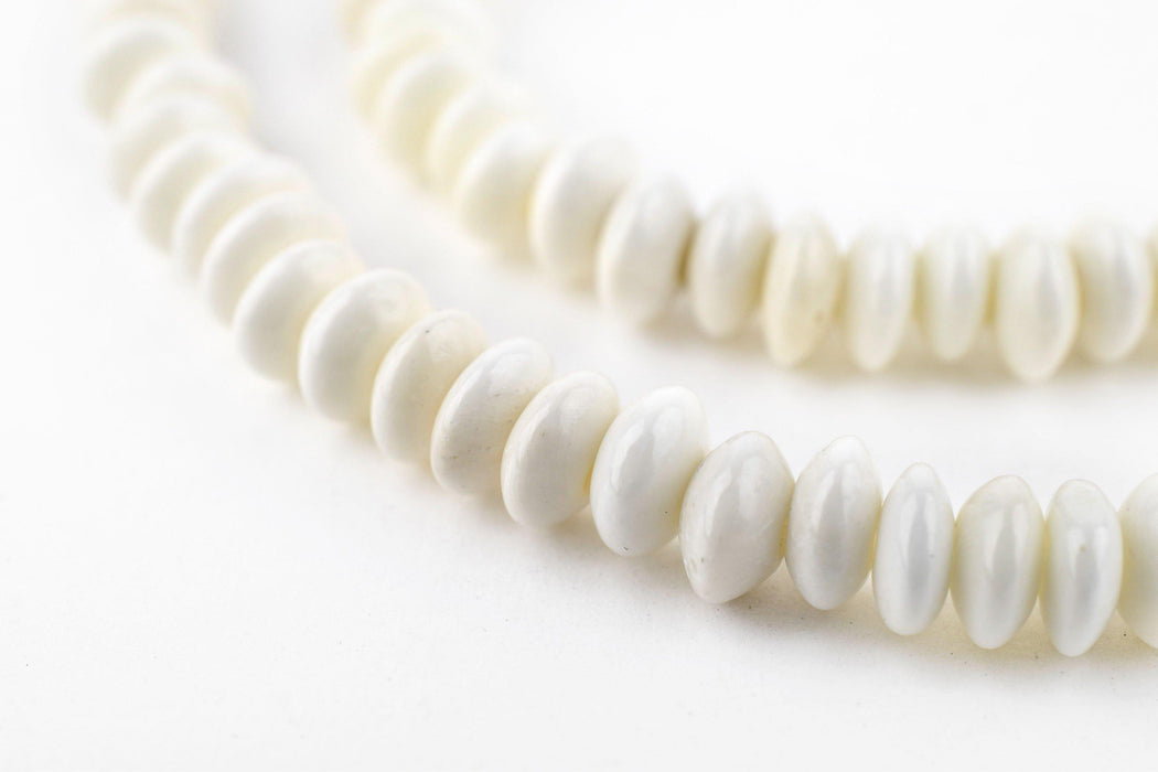 These white color saucer beads are made from natural bone. The slight variations in colors and shape of the beads will make them a fun addition to your beading project. Look carefully and you will see that each bead is unique. Individual beads measure 2-3 x 5-6mm with approximately 138 beads on each 16" strand. Use them as spacers or accent beads. Note that current stock may NOT have black string. The rustic character of these beads is sure to add an authentic touch to your jewelry designs!