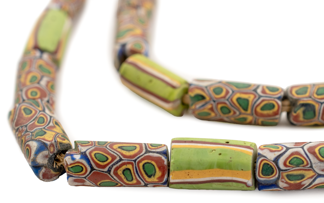 Take a look at this beautiful antique strand of Venetian Millefiori trade beads! Celebrated among the most distinctive of beads, the Millefiori has become nearly synonymous with the West African Trade. Made from famed Murano glass, Millefiori beads derive their name from the Italian words for “Thousand Flowers” due to the characteristic floral motifs that decorate their surface. Millefiori beads were made throughout the 19th and 20th century primarily for export to Africa. Today they are found in many countries including Ivory Coast, Nigeria, and Ghana where they are also known by their Ashanti name “Chachasao”. Most beads are commonly cylindrical in shape but other varieties exist including rectangular, oval, and sometimes even hexagonal beads. You will receive the exact strand pictured. Measurements are approximations.