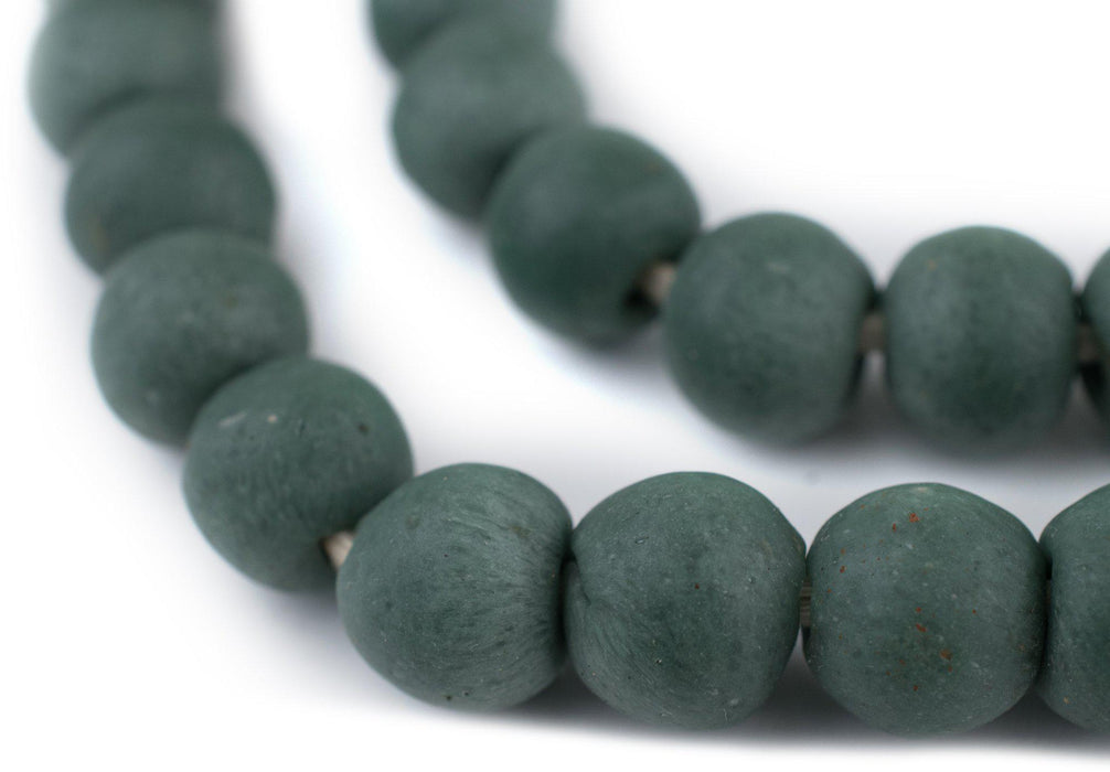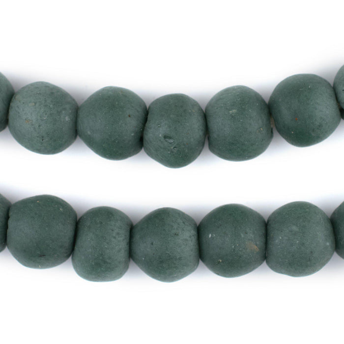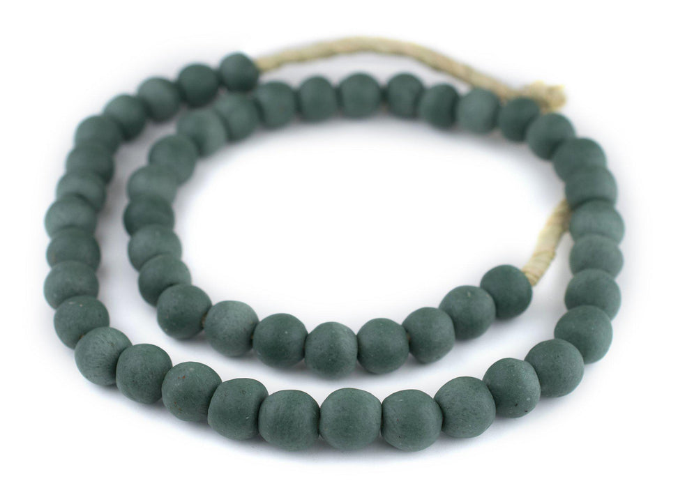 These beautiful recycled glass beads are handmade by artisans in the West African country of Ghana. Each bead is individually handcrafted through a traditional process passed down generation to generation. The steps involve crushing glass into tiny pieces, placing it in a mold, and then heating the crushed glass at high temperatures in a clay oven. Different types of glass are used including old cola bottles, broken tiles and windows, and other types of repurposed glass. The beads on this strand measure approximately 11-12 x 13-14mm with a hole size of approximately 2mm. Each strand measures about 28" long. Shade may vary slightly from photo. Get your strand today!