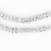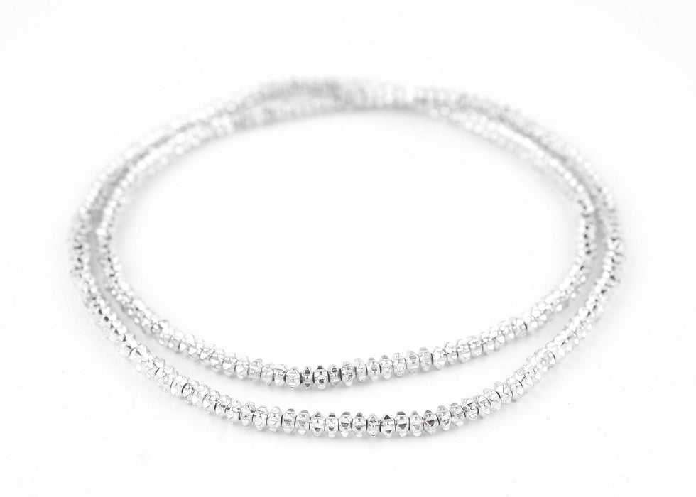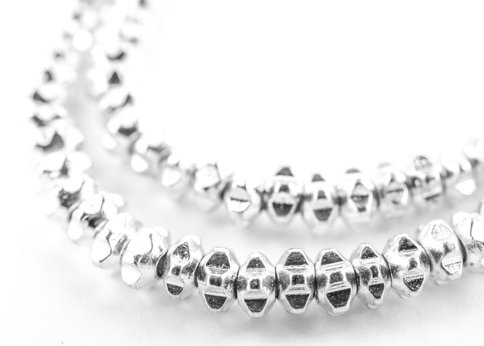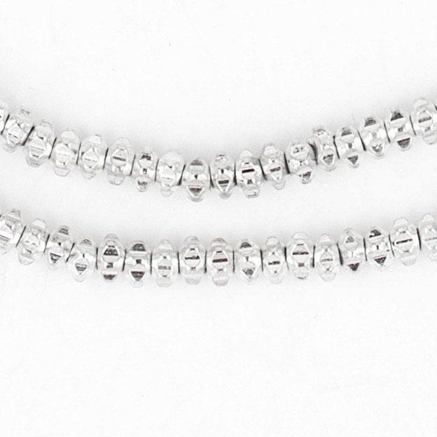 Admire these artisan white metal silver beads. Each artisan strand measures in at approximately 24" in length. Each bead is about 2 x 4mm in size and roughly has a 1.5mm stringing hole. These chrome beads make for awe-inspiring spacers in jewelry designs and can make for great interior design accent pieces when placed around the house. With so many different way to use them you're going to get a lot out of these beads! Get your hands on some today!