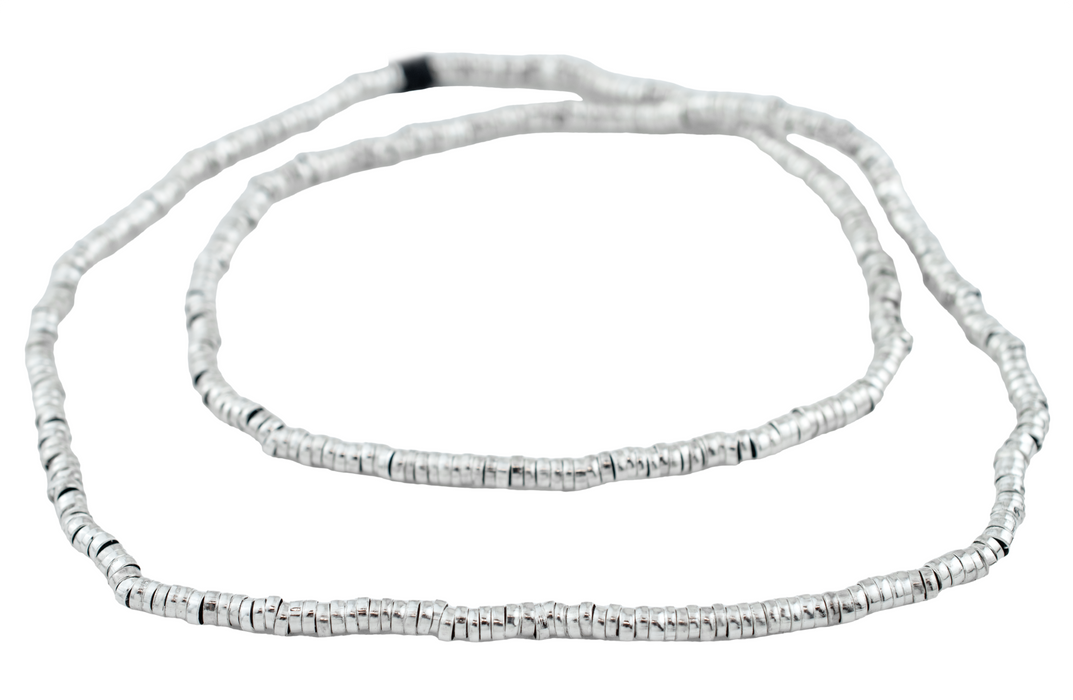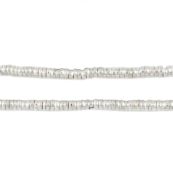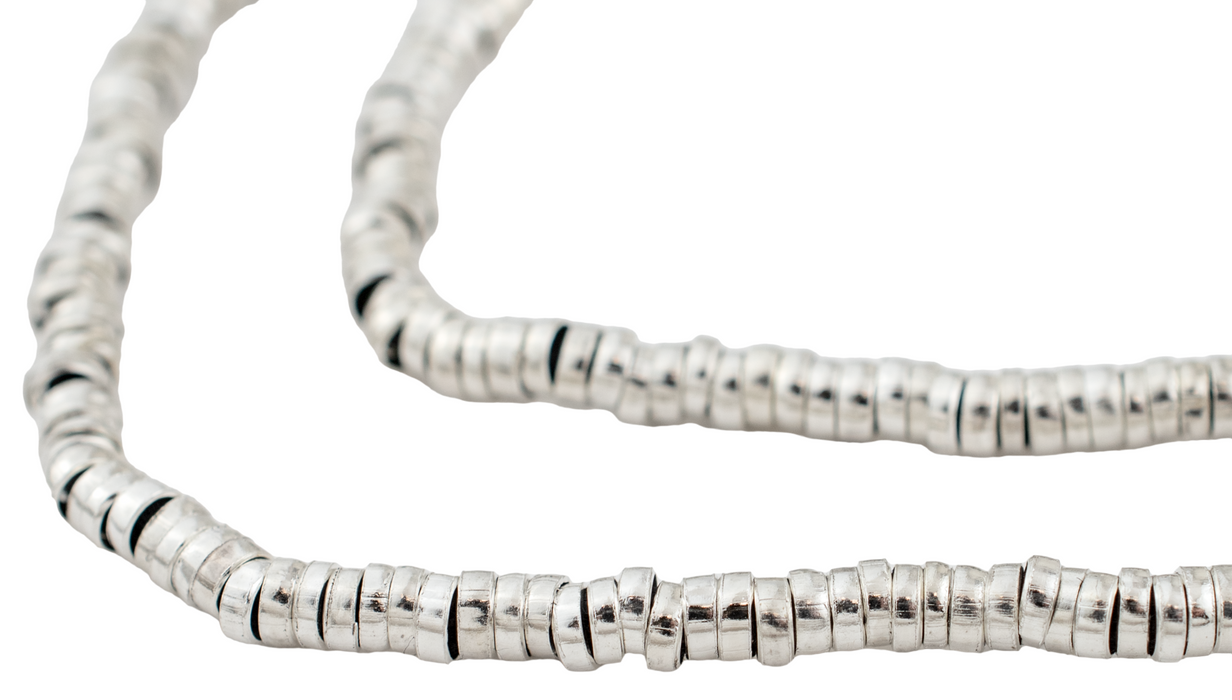 Take a closer look at this great strand of shiny silver ring-shaped beads. These metal beads are super useful and can easily be used as spacers and accent beads in your design projects. Each bead measures about 1.5 x 4mm with a generous hole size of roughly 2mm. Perfect for thicker cords. You will receive one full strand measuring approximately 24" in length. Add this staple bead style to your design toolkit today.