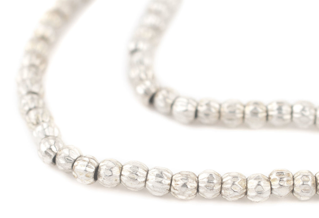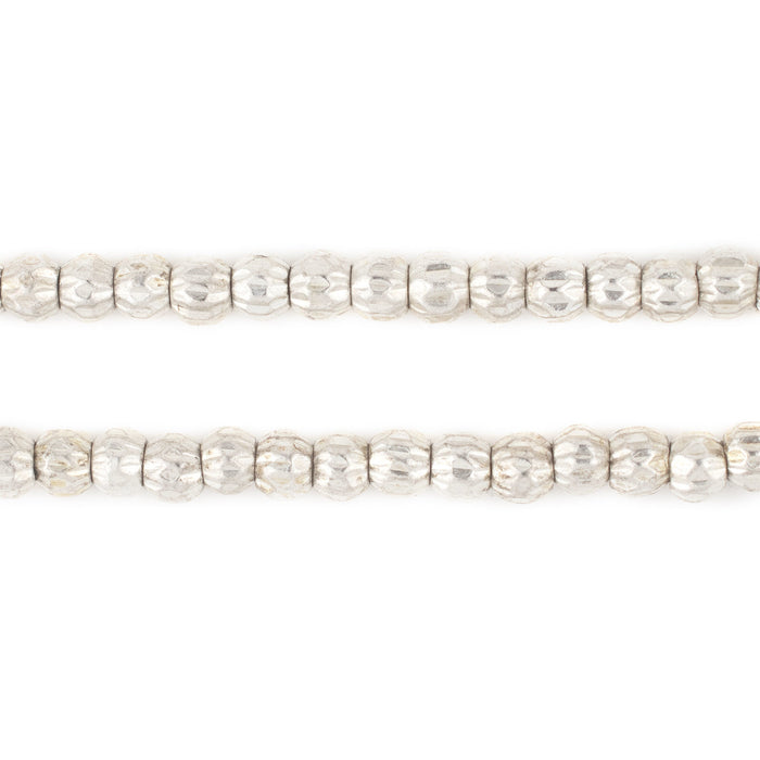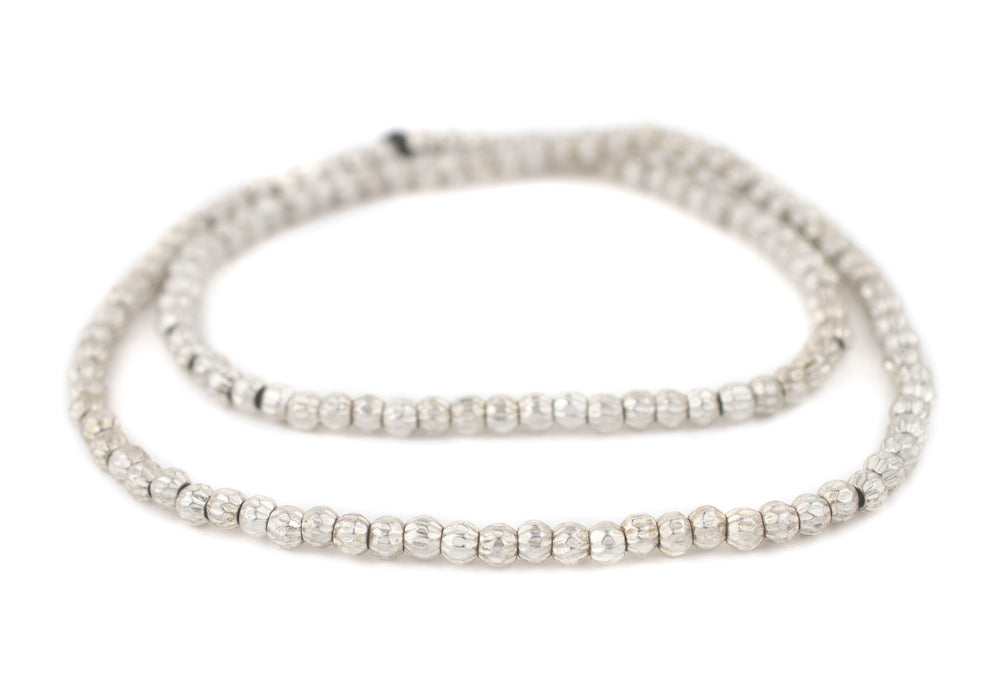 Beautiful strand of high quality, silver beads measuring 24" in length. Individual beads measure 4 x 5mm in size, with holes measuring approximately 1mm. Each strand includes approximately 135 beads. These highly versatile beads make great spacers, or may be used to accent your unique beaded designs. Feel the solid weight of these beads in your hands, and you'll surely appreciate their fine quality.