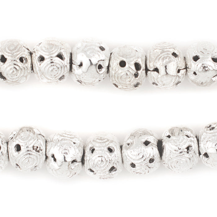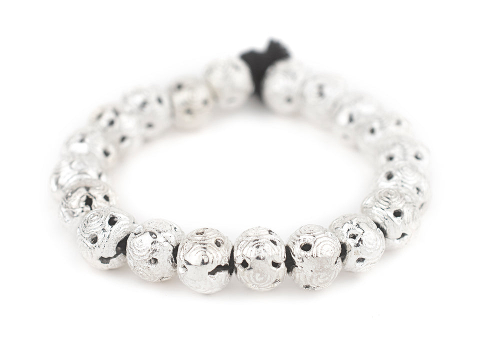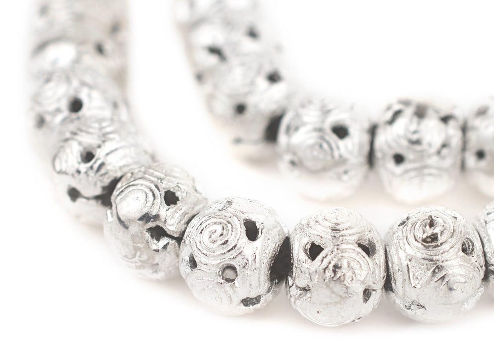 Admire these exceptional silver beads made in a design that originates from the Ashanti people of Ghana, West Africa. The Ashanti are the largest tribe in Ghana and are known for their master bead-making skills. This shape is a traditional design that is particular to Ashanti jewelry. Each bead measures approximately 10 x 12-13mm with about 20 beads on a string.