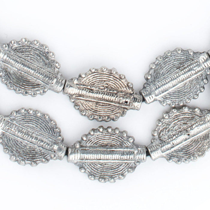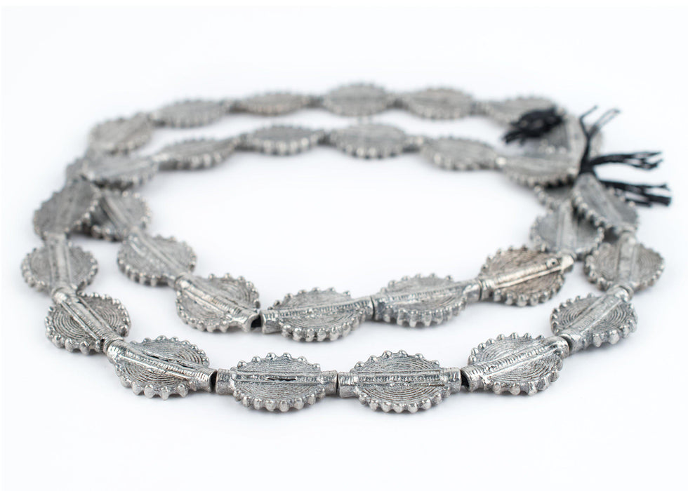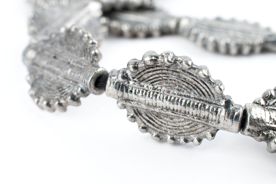 These beautiful white metal beads are hand casted in the design of traditional Baule beads from the Ivory Coast. Increasingly difficult to find, Baule (also known as Baoule) tribal beads are some of the most unique casted beads from West Africa. Each bead measures approximately 26 x 19mm, with a hole size of approximately 2mm. Strand length is 17". We've partnered with a special workshop to bring these unique treasures to you. Pay close attention to the detail and note the high quality finish of these special beads. Multiple strands pictured. Each strand sold individually. Get yours today!