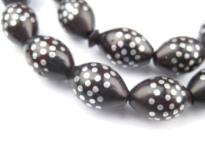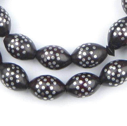 Evocative of a lost world, these beautiful Arabian prayer beads have been handcrafted by a master artisan. Look carefully and you will see that each bead has been exquisitely inlaid in meticulous detail, a quality of work hard to find in today’s day and age. The refined quality of these beads belies the long journey they have traveled through the back alleys and markets of North Africa. Prayer beads such as these embody the intersection artistic expression and faithful devotion that are a cornerstone of the Islamic world. Each bead on this strand measures approximately 14 x 10mm with hole size of 1mm and strand length of 24" long. Metal inlay may not be sterling. Use as-is or to accent your beaded creations. Limited Supply. Get yours today!
