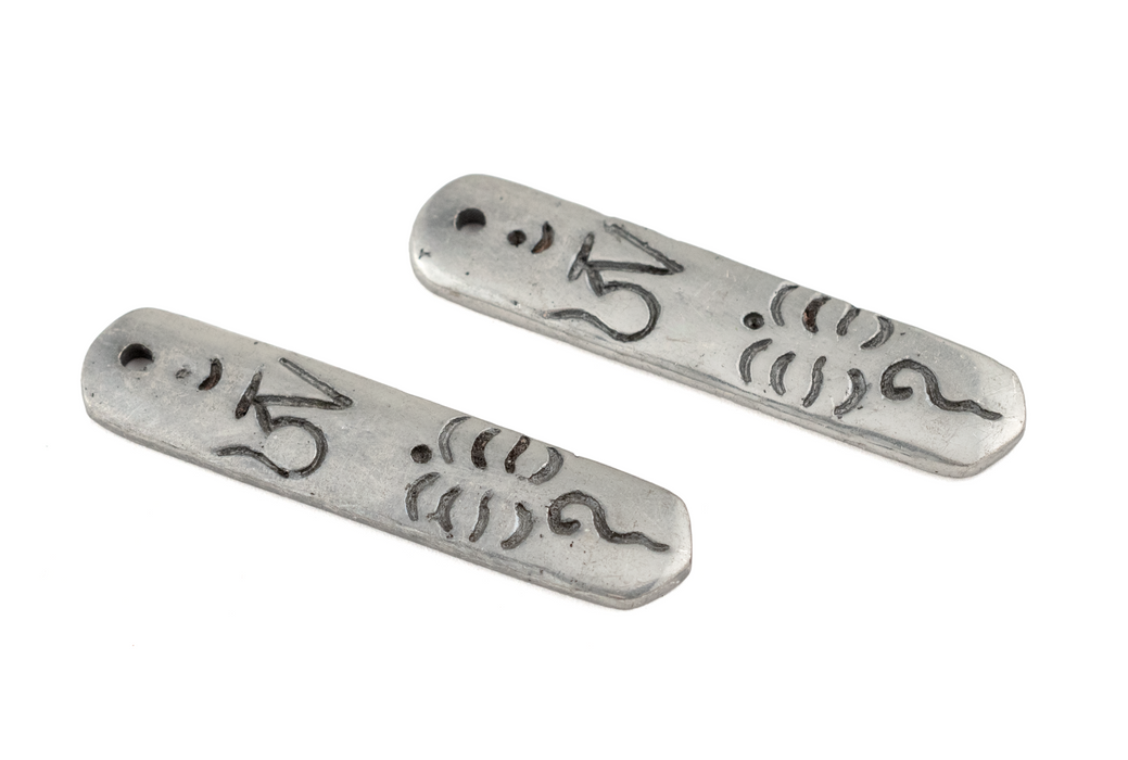 This traditional pendant was hand-casted and features the time-honored "Om" symbol. Om, commonly written as Aum, is a sacred and mystical syllable that originated from Hinduism but is now also common to Hinduism, Sikhism, Jainism, and Buddhism. This Om pendant is of exceptional quality. Measuring approximately 50mm in length, this pendant has a hole size of 2mm. Available in brass, silver, and copper finishes. Incorporate into your jewelry designs, or simply throw on a leather cord to wear as is!