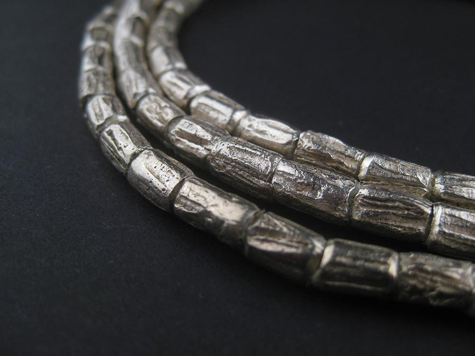 Beautiful strand of silver beads from Ethiopia. The uneven surface of these beads creates a unique scratch-like appearance that resembles tree bark! These beads are handmade and strung so each strand can vary slightly in bead size and strand length. Please let us know in advance if you have specific needs.