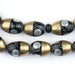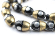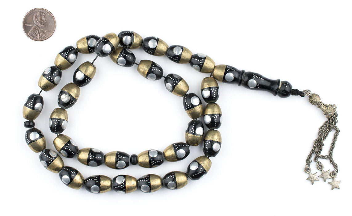 Evocative of a lost world, these beautiful Arabian prayer beads have been handcrafted by a master artisan. Look carefully and you will see that each bead has been exquisitely inlaid in meticulous detail, a quality of work hard to find in today’s day and age. The refined quality of these beads belies the long journey they have traveled through the back alleys and markets of North Africa. Prayer beads such as these embody the intersection artistic expression and faithful devotion that are a cornerstone of the Islamic world. Each bead on this strand measures approximately 14-15 x 10-11mm with hole size of 1mm and strand length of 22-27" long. Metal inlay may not be sterling. Use as-is or to accent your beaded creations. Limited Supply. Get yours today!