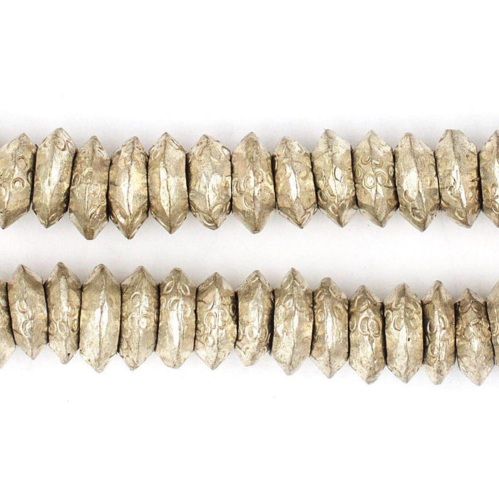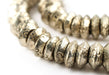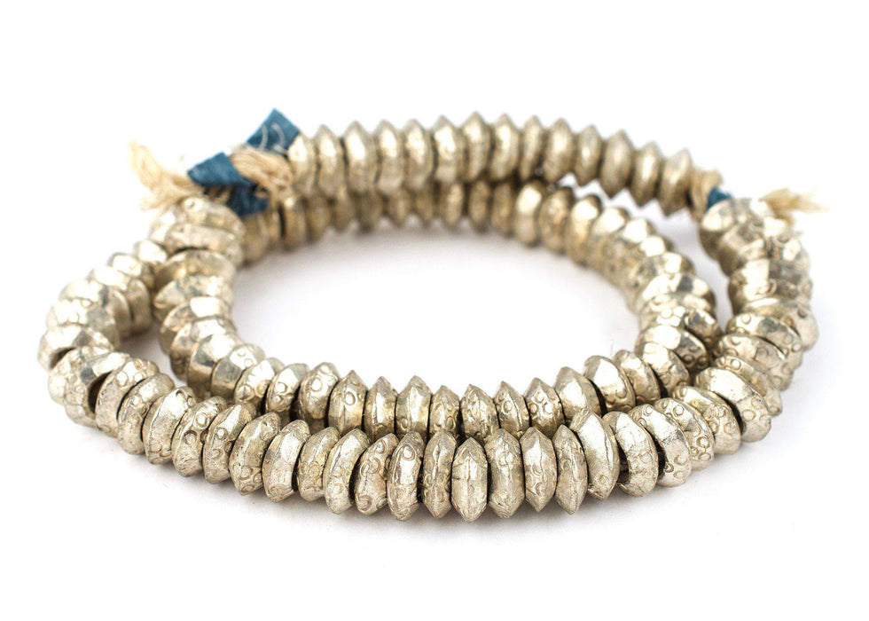 Check out this strand of unique white metal rings from the Wollo region of Northern Ethiopia. These handmade rings are individually crafted in a traditional design and make great adornments for jewelry creations. Individual rings measure 4-5mm wide by 11-12mm in diameter. Hole size is approximately 5-6mm. Up to 20% of rings may be 13-14mm. You will receive a full strand of 100 rings for each purchase.