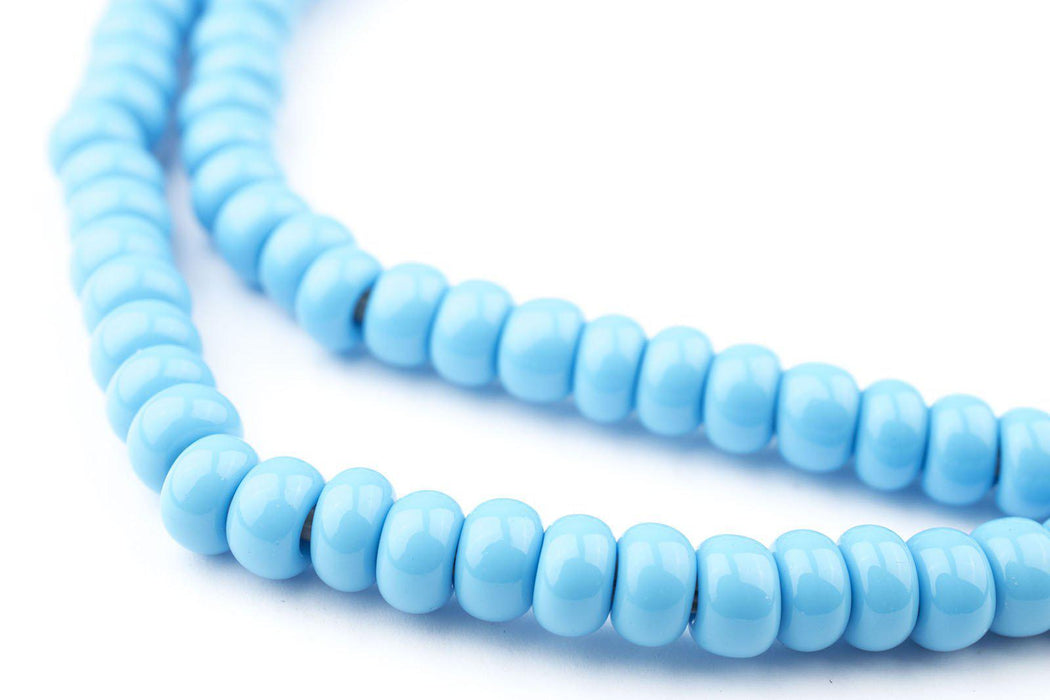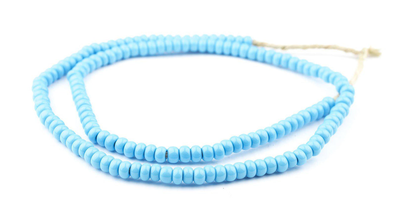 High-quality strand of blue color small glass beads from Ghana. Each bead measures approximately 4 x 7mm with strand length of 27". Some variation in individual beads is shown as pictured. Use these as spacers or mix and match colors to express your unique style!