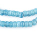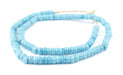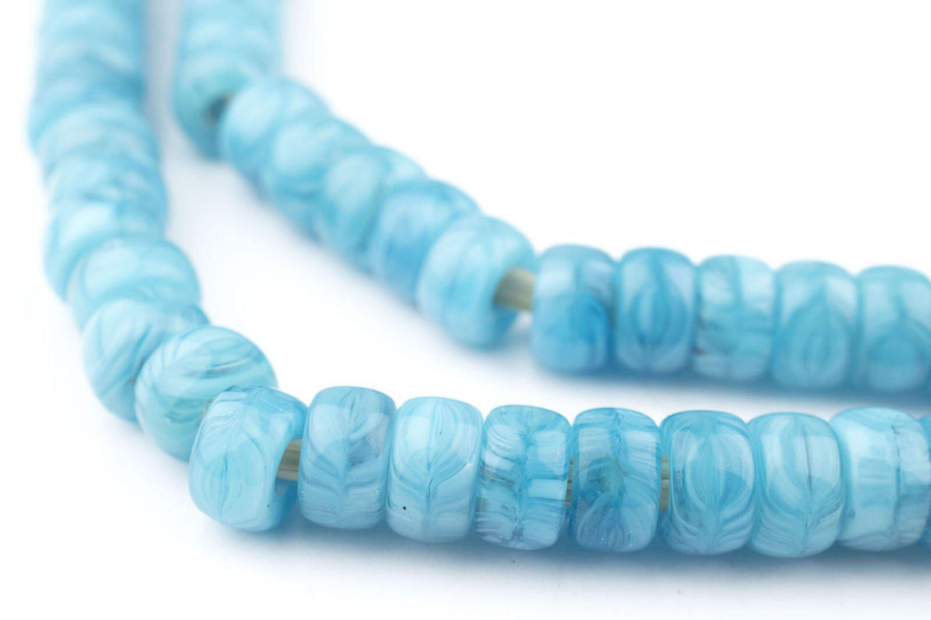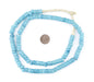 These blue czech-made "Prosser" beads were strung and traded in West Africa. Modeled after vintage "kakamba" beads, these beads each have a unique texture and swirl of different glass colors, but are considered a newer production. Each bead measures approximately 6 x 9mm, with hole size of 3mm. Strands measure approximately 28" in length, containing approximately 110 beads each.