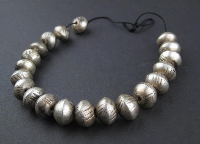 Admire this strand of artisanal Ethiopian white metal beads. Individually fashioned by an expert craftsmen, these bicone beads measure 12x17mm with approximately 20 beads per strand. Light-weight and versatile these special beads will add character to your original designs. Each strand is unique and may vary slightly from strand pictured.