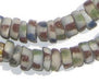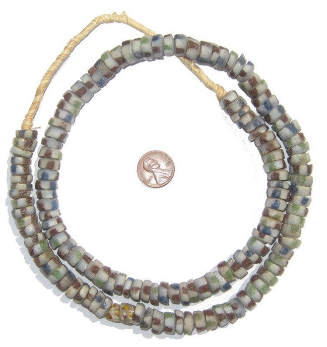 Checkout this beautiful multicolored strand of African sandcast beads. The process of making these beads is unique to Africa and has been used for over 1000 years. Pulverized glass of various colors is poured into a clay mold, using a cassava stem for the bead's hole. The mold is placed in a furnace and heated until the glass particles congeal without actually melting and the stem burns out. The Ghananians have been making beads in this manner since the 1600s.