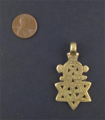 This Ethiopian Star of David is made by the Falasha community of Ethiopia and would make a beautiful necklace...all you have to do is run a chain through it! This artisanal cross is made with brass which is less common than silver designs. The pattern on the back of the cross is similar to what is shown on the front so these pendants are basically double-sided! Small pendants measure APPROXIMATELY 1-1.5'' wide and 1.5-2.5'' in length. Each pendant is unique and may vary slightly from picture.