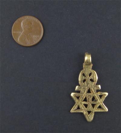 This Ethiopian Star of David is made by the Falasha community of Ethiopia and would make a beautiful necklace...all you have to do is run a chain through it! This artisanal cross is made with brass which is less common than silver designs. The pattern on the back of the cross is similar to what is shown on the front so these pendants are basically double-sided! Small pendants measure APPROXIMATELY 1-1.5'' wide and 1.5-2.5'' in length. Each pendant is unique and may vary slightly from picture.