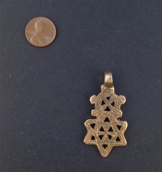 This Ethiopian Star of David is made in the Jewish tradition by the Falasha community of Ethiopia and would make a beautiful necklace...all you have to do is run a chain through it! This artisanal cross is made with copper and is highly uncommon. The design on the back of the pendant is similar to what is shown on the front so these pendants are basically double-sided! Small pendants measure APPROXIMATELY 1-1.5'' wide and 1.5-2.5'' in length. Each pendant is unique and may vary slightly from picture.