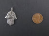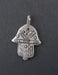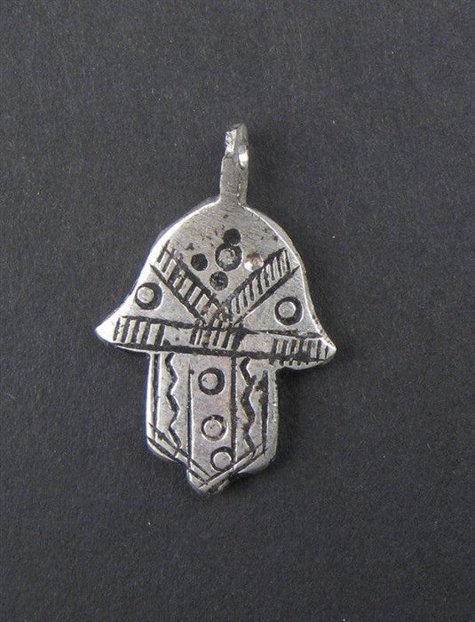 This handmade Hamsa pendant was made in Southern Morocco. The Hamsa is a traditional Middle Eastern and North African symbol intended for protection from harm. This pendant measures 34mm long by 21mm wide. Pendant may show some signs of wear and may show minor variation from design pictured.