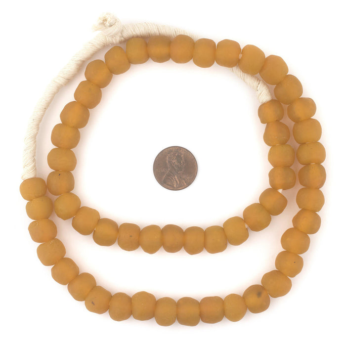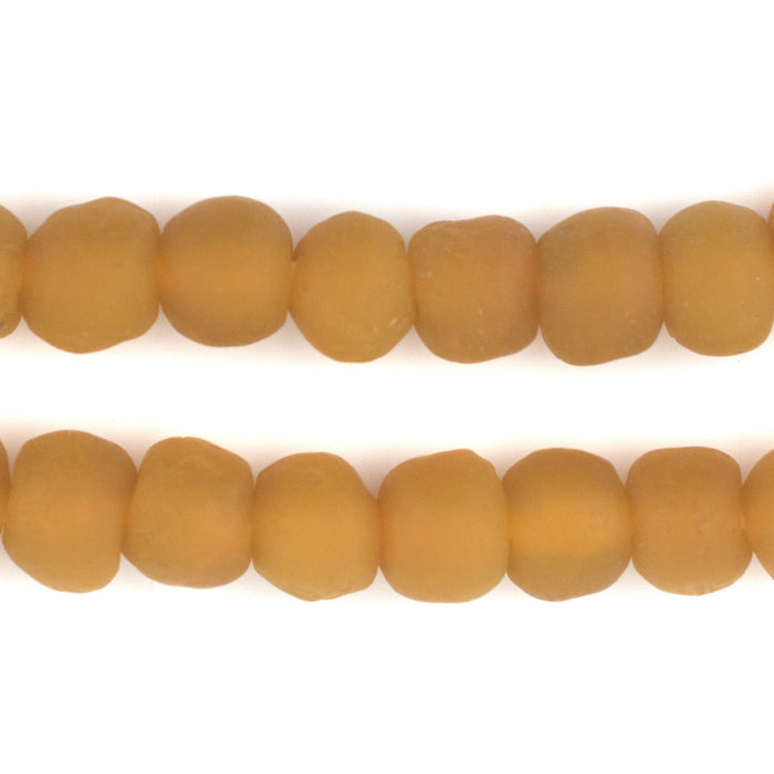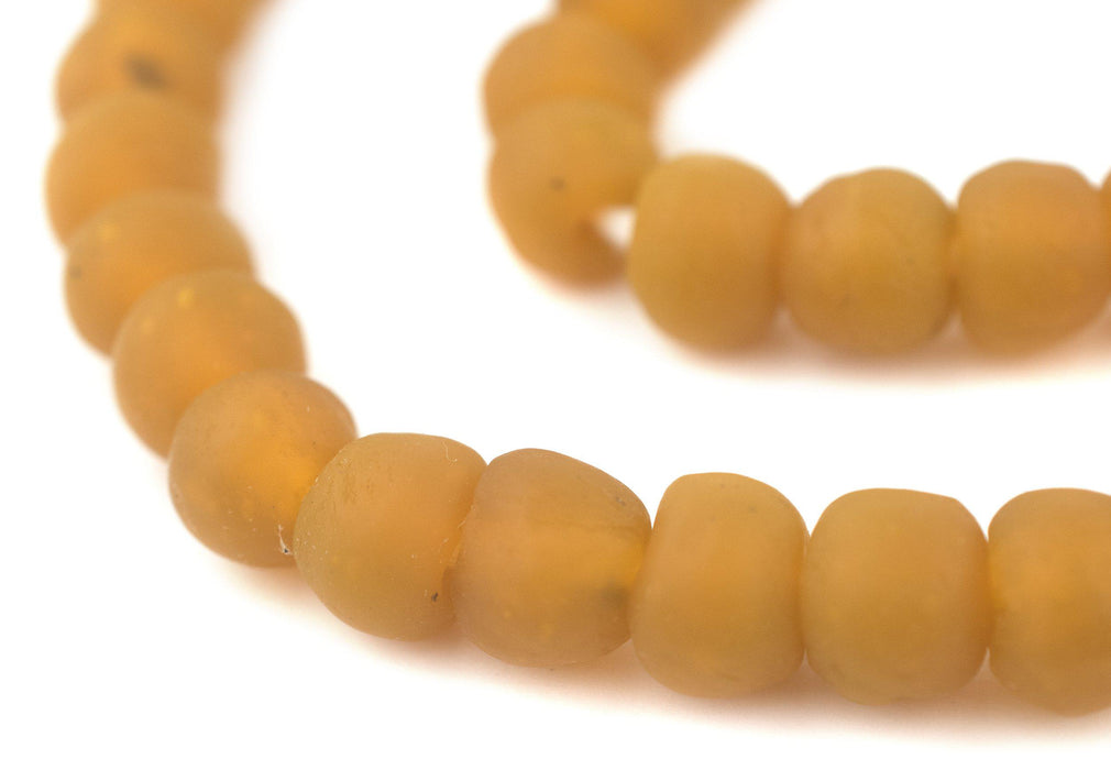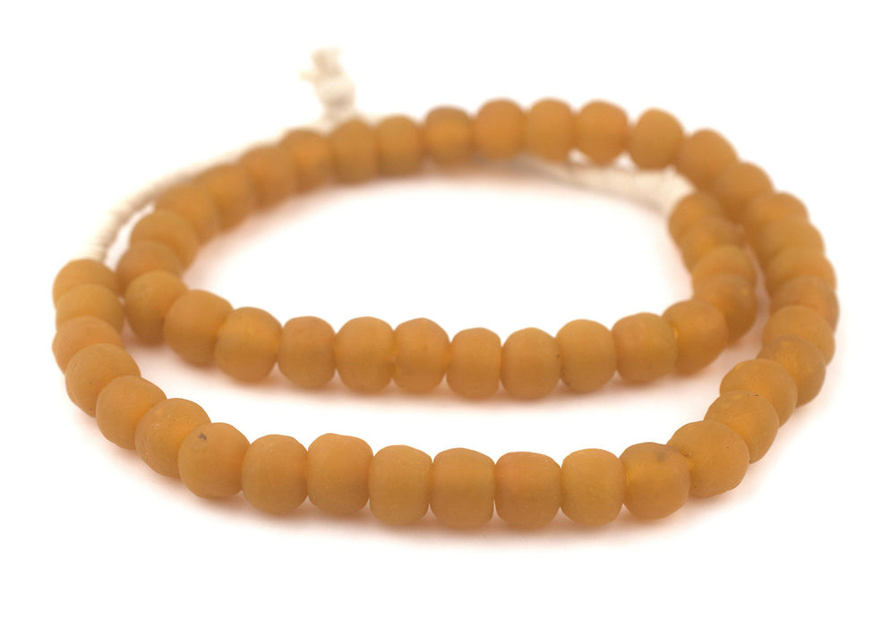 Recycled glass beads are a type of indigenously produced African bead from Ghana West Africa. These beautiful mango orange color recycled beads are made using an old method that has been used for centuries. The glass itself is derived from a variety of recycled sources including old beverage and medicine bottles. The procedure for making the beads consists of a number of steps whereby powdered glass is poured into molds of clay and baked in a specialized oven. These beads are produced in large part by the Krobo tribe and through recycling glass are environmentally friendly.