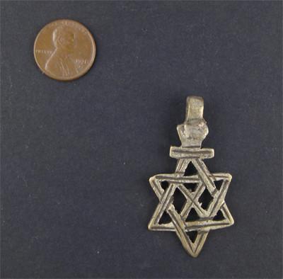 This Ethiopian star of david pendant is made by the Falasha community of Ethiopia and would make a beautiful necklace...all you have to do is run a chain through it! The pattern on the back of the cross is similar to what is shown on the front so these pendants are basically double-sided! Small crosses measure APPROXIMATELY 1-1.5'' in width and 1.5-2.5'' in length. Each pendant is unique and may vary slightly from picture.