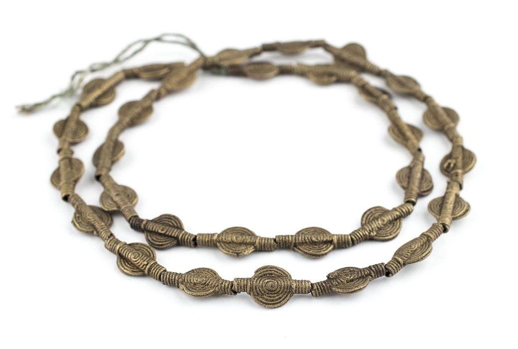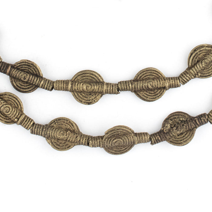 Great strand of miniature Baule Brass beads from the Ivory Coast. This is one of the smaller sizes of these beads that we've seen. Each bead will measure approximately 18-20mm wide by 10mm diameter. So many uses for these beads. Get the Baule look without the size and weight! These beads are made will hand and it is not uncommon for some beads to have imperfections. Another great strand for your collection!