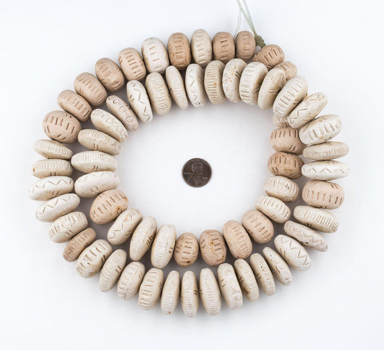 These African clay beads were made by independent artisans in South Africa. After shaping the beads, traditional motifs and patterns are oftentimes engraved into the bead before placing them into the kiln. Each bead measures approximately 10-19 x 20-30mm with a hole size of 2mm. Strands measure approximately 38" in length. Get yours today!