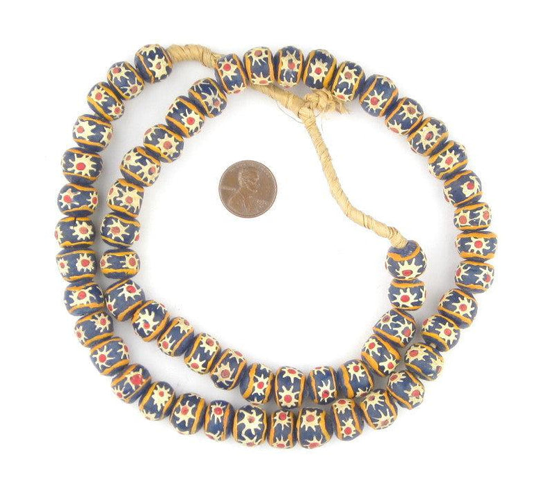 A beautiful strand of powder glass African beads, made by the people of Krobo Mountain (Ghana, West Africa), reproducing old Venetian FANCY trade beads. Made from bottles and other glass items that are turned into powder, then poured into molds in order to create this nice looking drum shaped beads. Decorations on the beads are made with a paste made of colored glass powder and water, which is applied using a thin wooden stalk. They are cooked a second time to fix the decor. The beads are handmade.