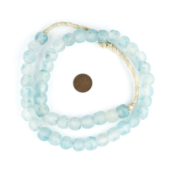 Recycled glass beads are a type of indigenously produced African bead from Ghana West Africa. These beautiful blue color recycled beads are made using an old method that has been used for centuries. The glass itself is derived from a variety of recycled sources including old beverage and medicine bottles. The procedure for making the beads consists of a number of steps whereby powdered glass is poured into molds of clay and baked in a specialized oven. These beads are produced in large part by the Krobo tribe and through recycling glass are environmentally friendly. Darkness of blue may vary slightly from strand to strand.