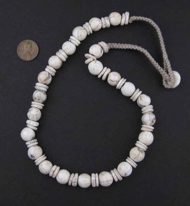 Admire the detail of these unusual beads fashioned by hand in a medley of shapes from the natural shell of the ocean conch. The material for these unique beads is said to have been traded from the Bay of Bengel north towards the Himalayan mountains. No two beads are alike however beads measure approximately 3-11 x 9-12mm diameter with hole size of . The length of strand measures about 21â€. Each strand is unique and may vary slightly from photo. Beads may be used in your own special jewelry design however the beads have been nicely strung and the strand may also easily be worn as a necklace. Limited quantity available.