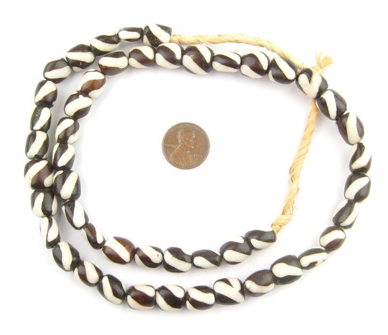 Checkout these beautiful large bone batik from Africa! These are hand-dyed beads from Kenya, Africa. The dying method is known as "batik", which is a wax relief process. The design on these is an interesting "SPIRAL" design, with the pattern going all the way around the bead. These beads are strung on sisal and could even be worn as is. The strand is approximately 25" long, and each bead is about 10-11mm in length and 8-10mm in diameter. Bead shape and pattern may vary slightly from photo. They are perfect for any of your beading needs!