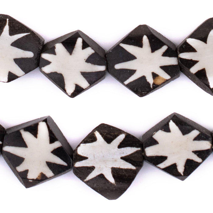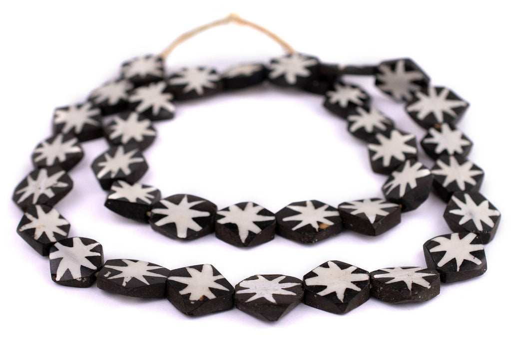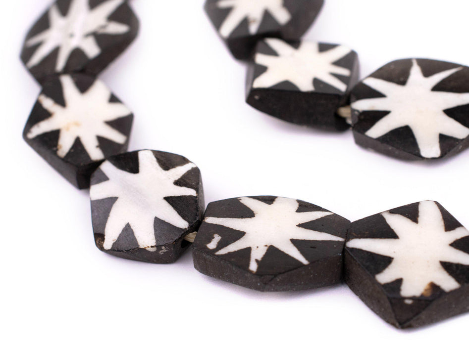 These Batik Bone beads are a traditional craft of Kenya. Each bead has been has been cut, polished, and patterned in a starfish design by hand. Batik bone beads are most frequently found in round and smooth shapes so these flat hexagonal beads are an innovative variant! Each bead measures approximately 19-21 x 17-22mm with a hole size of 2mm and a strand length of 30". The beads has been strung on natural raffia straw.