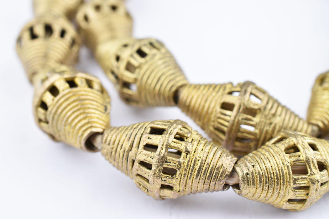 Take a look at these bicone-shaped Ghana Brass Trade Beads from Africa. Each bead is made individually through the "Lost Wax process" technique. This strand is about 27", with beads measuring approximately 23-26 x 13-15mm. Each strand may have 1-2 beads that are less than perfect and may vary slightly in pattern or tone from strand pictured.