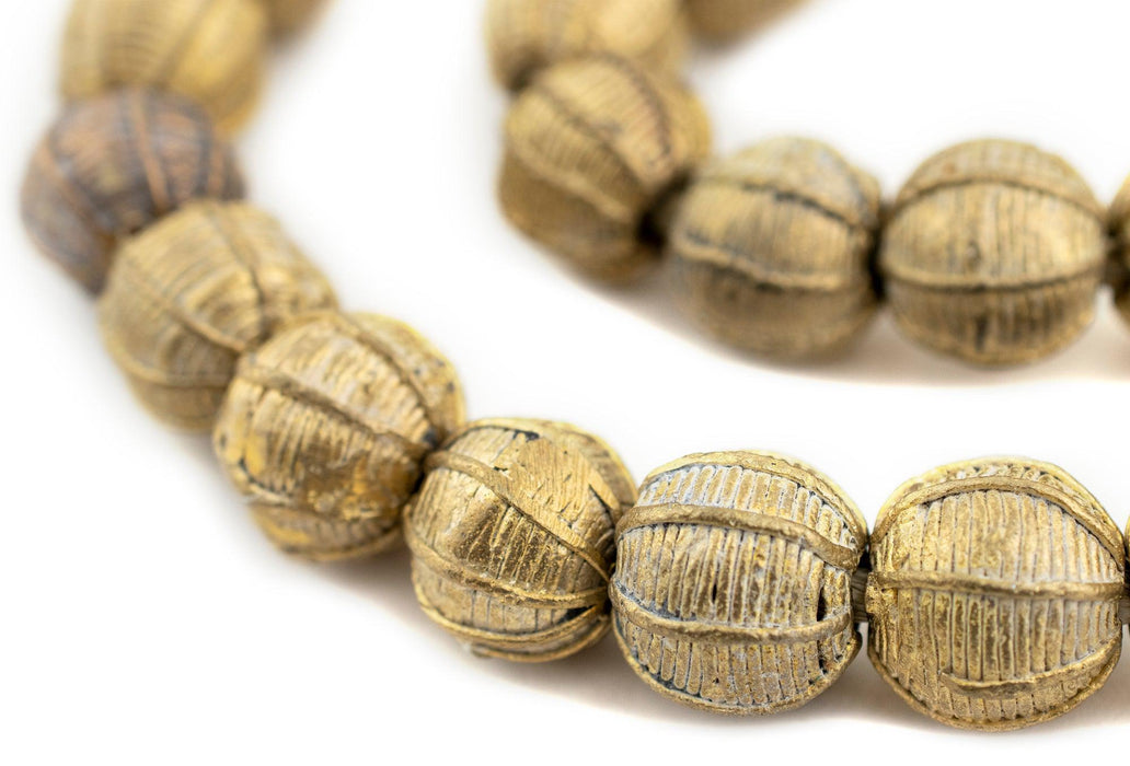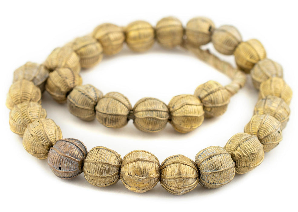 These Brass trade beads are from Ghana, Africa. Each bead is made individually through the "Lost Wax process" technique. The strand is about 26" long including raffia, and the beads measure approximately 18-20 x 18-20mm with a hole size of 3-4mm. This special design will add character to your unique jewelry, or can be used as a decor object! Please note, due to the handmade nature of these beads, there can be imperfections on some beads.
