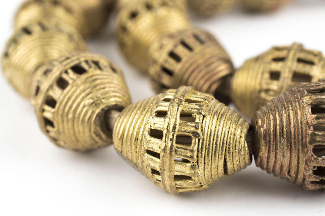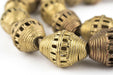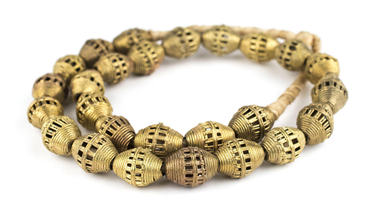 Take a look at these oval-shaped Ghana Brass Trade Beads from Africa. Each bead is made individually through the "Lost Wax process" technique. This strand is about 30'', with beads measuring approximately 22-24 x 18mm. Each strand may have 1-2 beads that are less than perfect and may vary slightly from strand pictured.